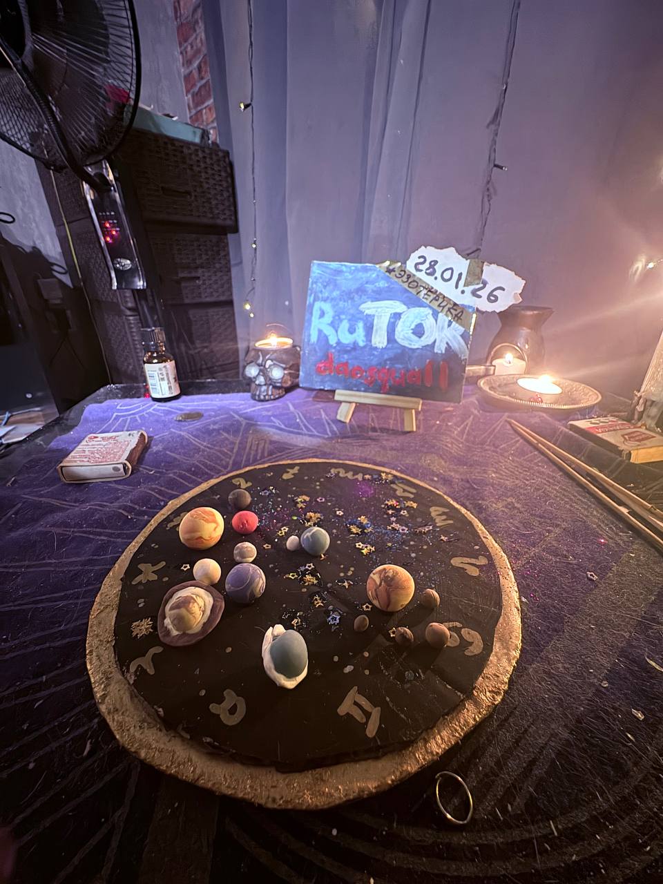 Я выбрала и сделала макет солнечной системы с тем, как будут располагаться планеты 17 февраля во время затмения, то есть архетип - затмение. Я родилась вблизи затмения и потому практически каждый коридор затмений меня как-то задевает. Особенно запомнилось прохождение затмений по оси отношений - Овен-Весы. Там были события... с одним парнем, с которым мы сами завязаны крепко-накрепко через затмения и обязаны были пройти путь вместе, длинный путь...