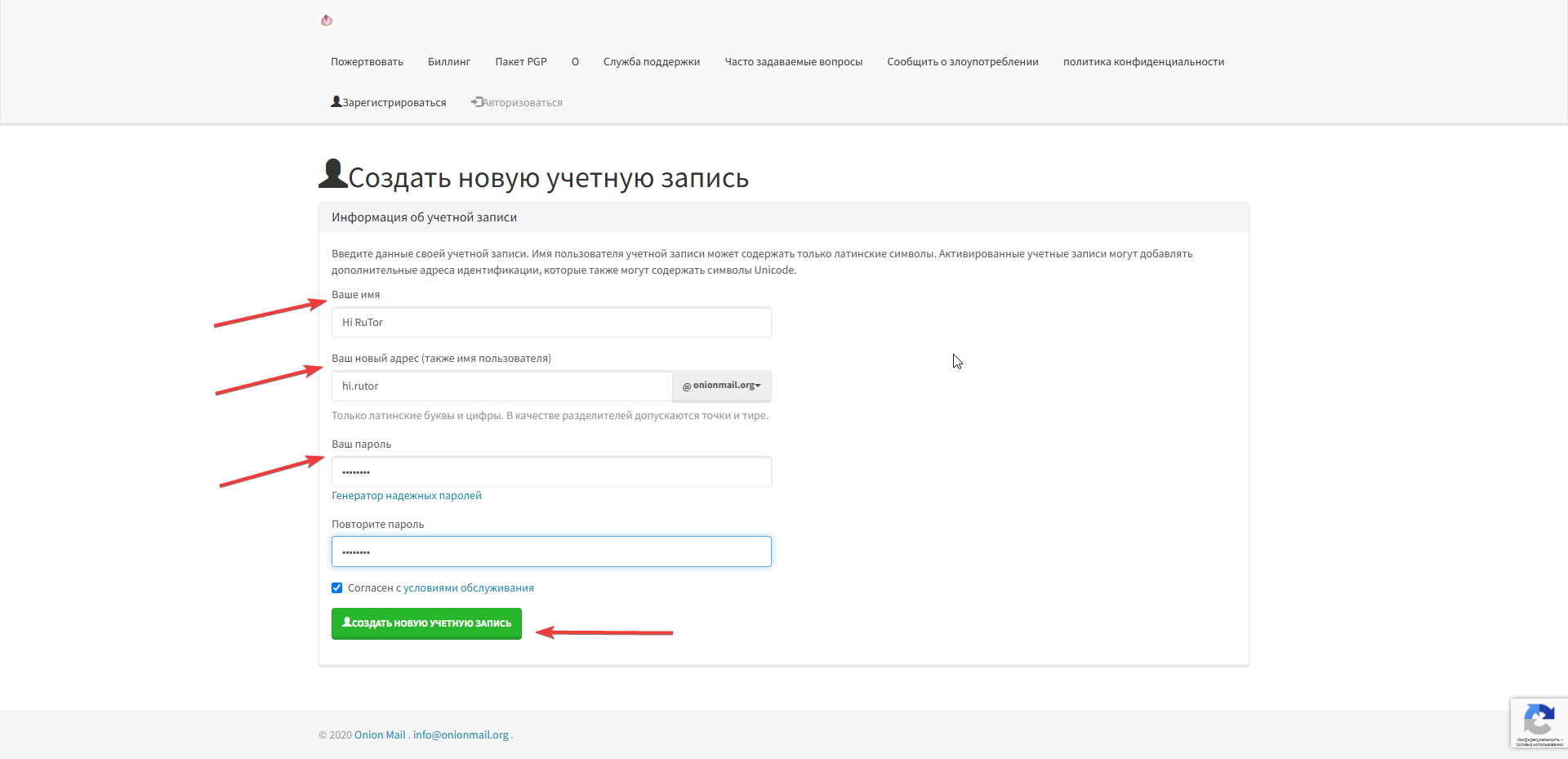 Просто указываем полученную анонимную почту ранее, желаемое имя и пароль